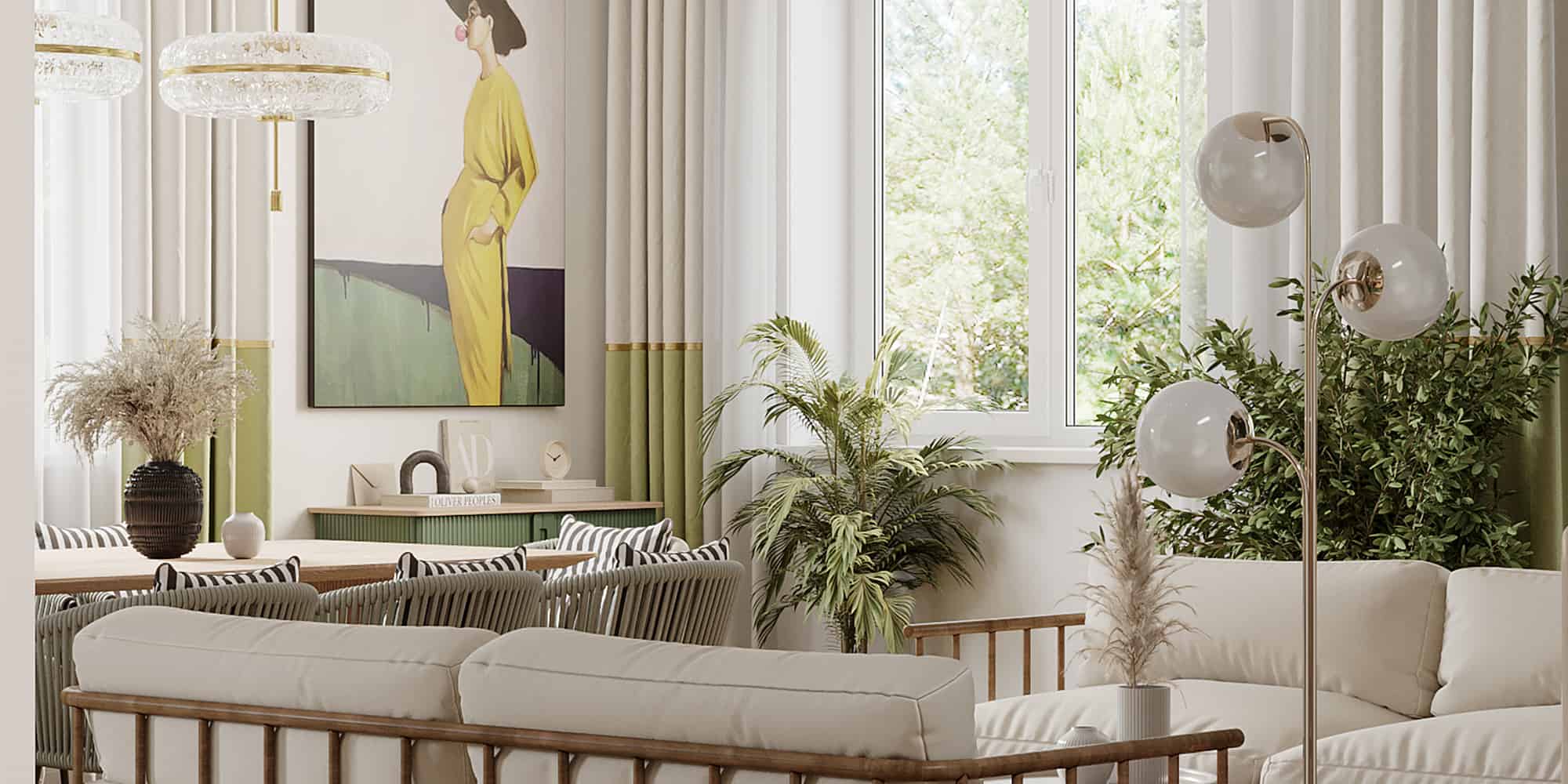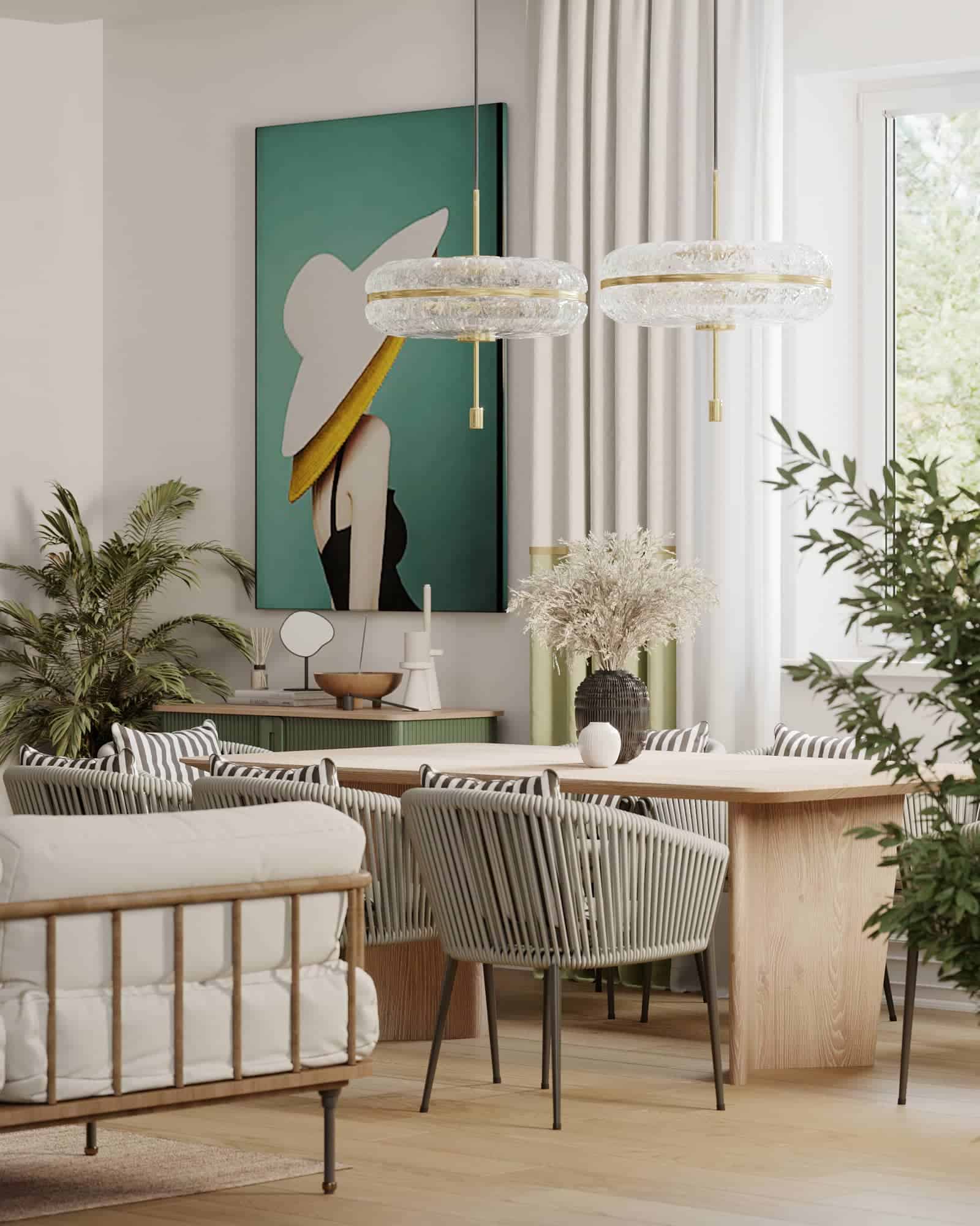 A sunlit, southern villa on the Mediterranean coast - a designer's dream, we thought, and this turned out to be true. This interior design project focused on bringing out the best of this wonderful property, and we made use of the abundance of natural light and the vibrant colours, drawing inspiration from the surrounding context. In this interior solution, boho style and subtle, endearing retro motives come together in a contemporary, saturated and very liveable home. Natural wood, lots of greenery, rattan woven furniture, clear bright azur, lemon and olive green tones create a very southern, cozy and expressive ensemble on the backdrop of off-white walls, clean geometry and the Mediterranean breeze from the windows.