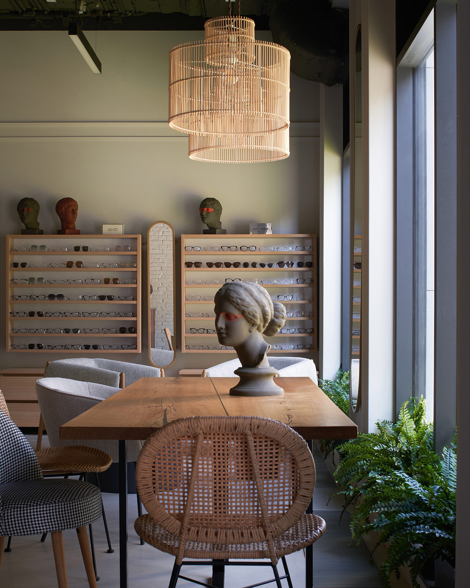 One of the examples of our work in the field of commercial interiors is a design project for the City Optics boutique, inspired by boho aesthetics and offering non-standard solutions to the functional problems of space.